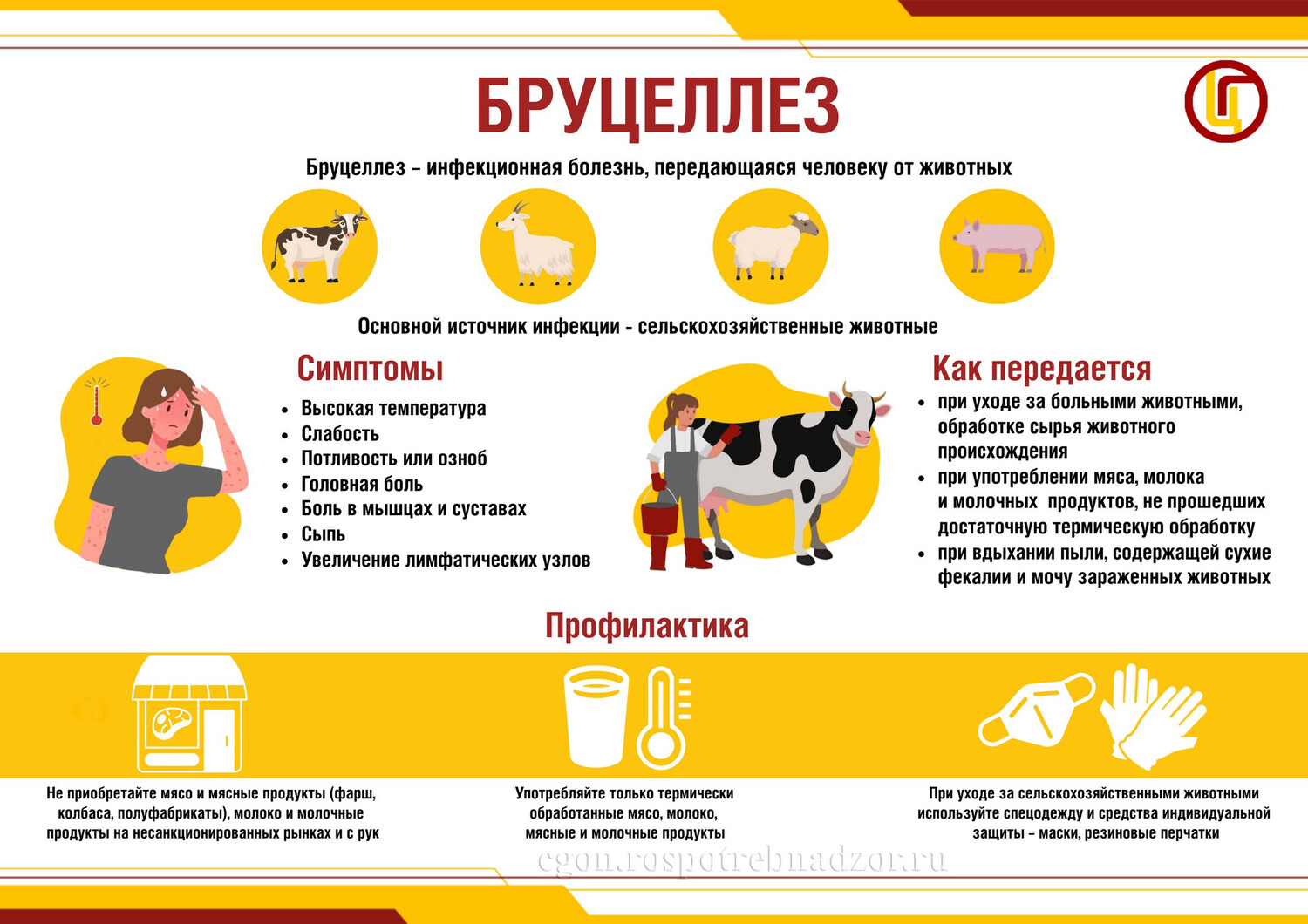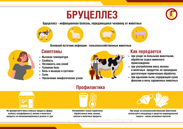 Бруцеллёз - это острое инфекционно-аллергическое, зоонозное заболевание, передающееся от больных, преимущественно, сельскохозяйственных животных человеку. От человека к человеку бруцеллез не передается. Общие симптомы бруцеллеза схожи с симптомами гриппа: лихорадка (наиболее высокие цифры возникают во второй половине дня), боли в спине, ломота в теле; плохой аппетит и потеря веса, слабость, головная боль; ночная потливость; боль в животе; кашель. Основными источниками бруцеллезной инфекции для человека являются сельскохозяйственные животные - овцы, козы, крупный рогатый скот, свиньи. Большинство случаев заражения происходит во время непосредственного контакта с инфицированным животным, предметами ухода, подстилками, остатками корма. Нередко реализуется алиментарный путь передачи инфекции при употреблении продуктов, полученных от больного животного и не прошедших достаточную термическую обработку или молочных продуктов из сырого молока (творог, сыр и т.д.). В сыром молоке, хранящемся в холодильнике, возбудитель бруцеллеза сохраняется до 10 дней, в сливочном масле - более 4 недель, в домашнем сыре - 3 недели, в сметане - 15 дней, в мясе - до 12 дней. В замороженных инфицированных мясных и молочных продуктах бруцеллы остаются жизнеспособными в течение всего срока хранения! Инкубационный период заболевания длится 1-2 недели, но может затягивается до двух месяцев, что определяется дозой возбудителя, попавшего в организм, его вирулентностью и сопротивляемостью организма. Заболевание начинается, как правило, с лихорадки, которая сопровождается ознобами, повышенной потливостью и общими симптомами интоксикации. Через некоторое время присоединяются симптомы поражения других органов и систем: опорно-двигательного аппарата, сердечно-сосудистой, центральной нервной и других систем. Симптомы бруцеллеза могут исчезнуть на несколько недель или месяцев, а затем вернуться. У некоторых людей бруцеллез становится хроническим, а симптомы сохраняются годами даже после лечения. В целях профилактики бруцеллеза: